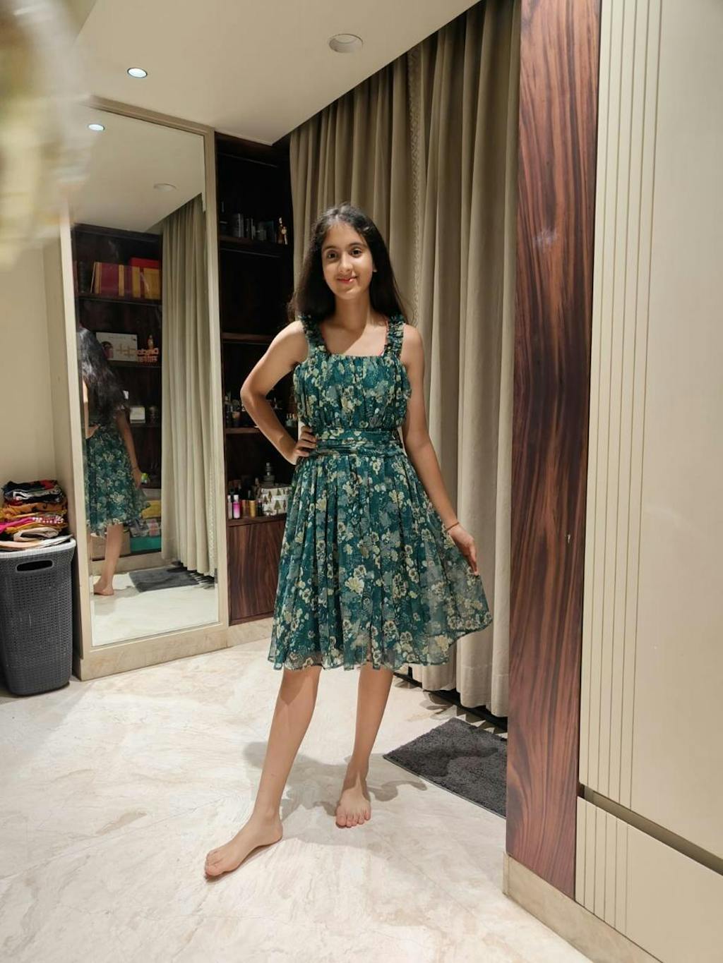 Our twilight princess- long flared dress is a magical dream for the little girls who are no less than a real life diva. The beautiful green floral print combined with the right amount of frills and flares and the beautiful back design is no less than the dream dress of a garden fairy. The dress features a snug fit and flared silhouette.