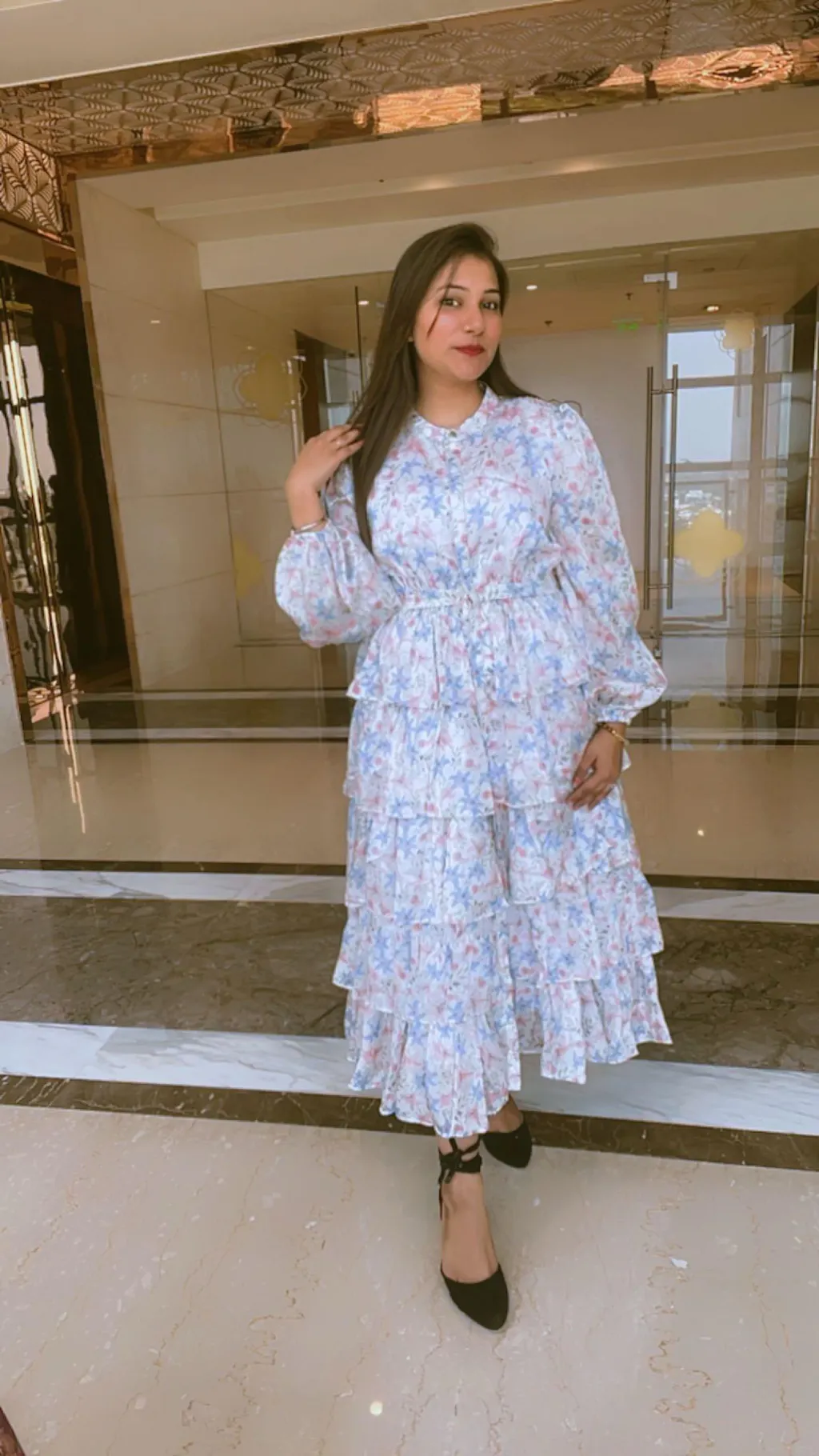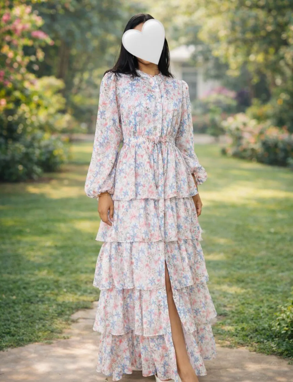 The long dress features a front open placket throughout, which you can open up till above knee to have that peek-a-boo moment with every step you take, or just close them all.