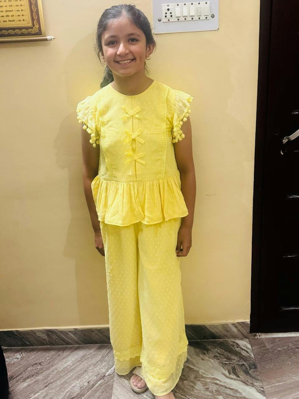 Whispering tales of spring, this enchanting co-ord set blooms with delicate pastel yellow color akin to a rising sun.