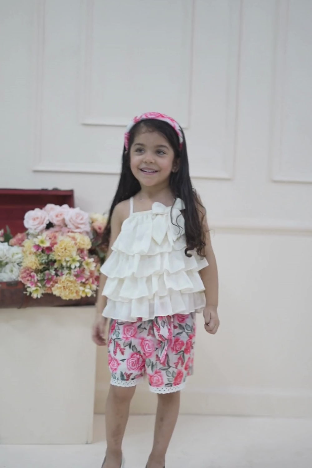 The set features a soft ruffled top with bow detail and shoulder straps perfect for summery days and coordinated flower adorned beautiful relaxed fit shorts which comes with a separate tie up belt. The cute ruffle details of the co-ord set adds the perfect finishing touch to the set.