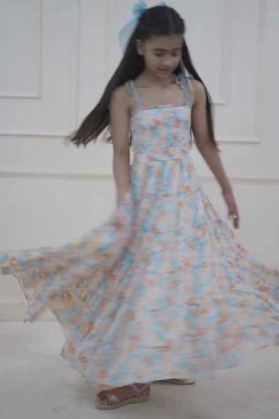 The peach blossom whimsy dress features a snug fit and flare silhouette. The dress has ivory base floral print. The elasticated top gives a comfortable fitting and the flared bottom is perfect for twirling in summers. The shoulder straps are adjustable.