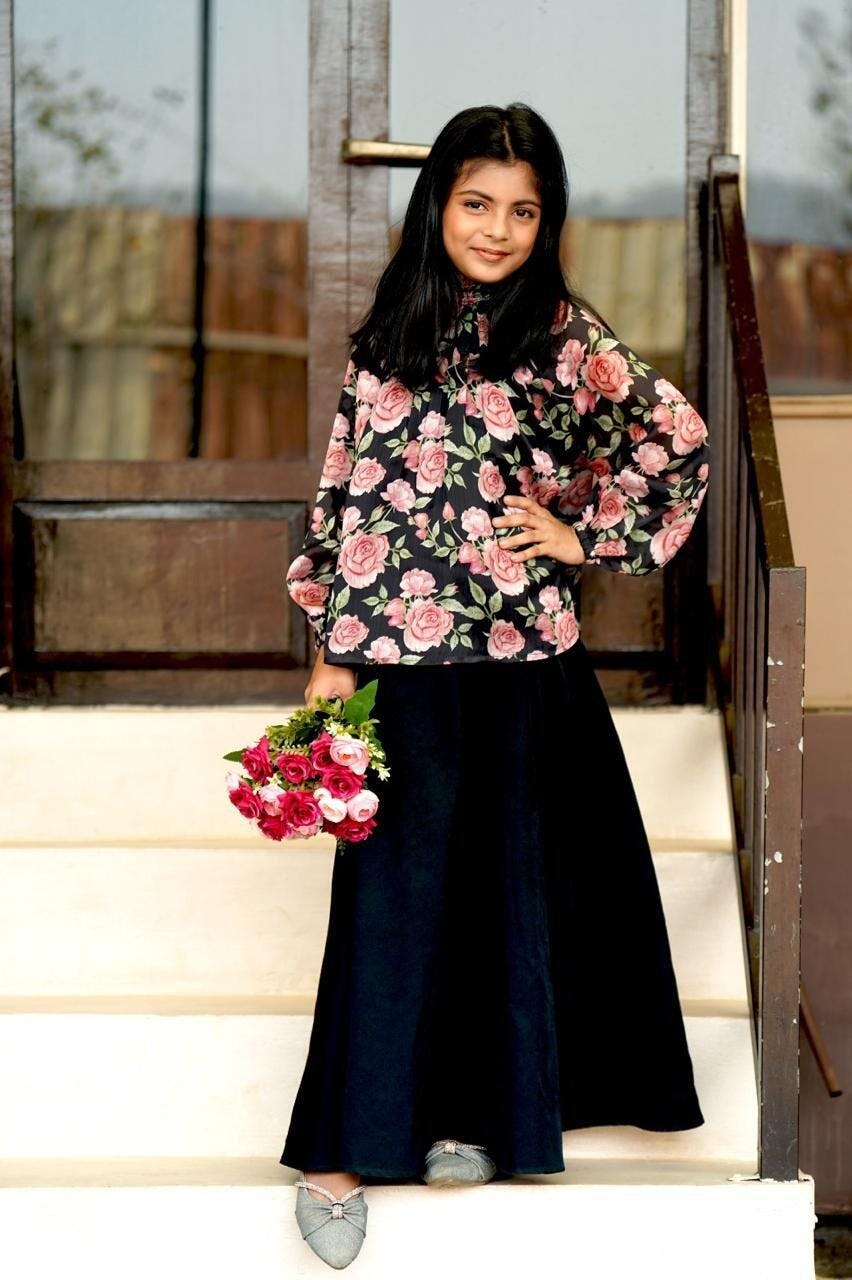 This chiffon top is a captivating mix of sophistication and floral charm and a wardrobe essential that never goes out of style, this classic black skirt is the epitome of sophistication and versatility.